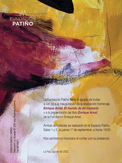 En ocasión de la exposición homenaje al pintor Enrique Arnal que inaugura la Fundación Patiño el jueves 1° de septiembre, a las 19:00, la Fundación Enrique Arnal presentará el libro «Enrique Arnal» sobre la vida y obra del artista boliviano. El libro cuenta con el generoso auspicio de la Pollock-Krasner Foundation y de la familia Ortiz.
