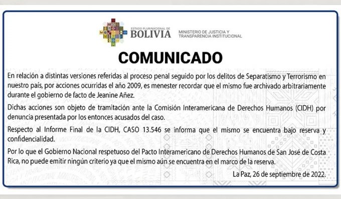 “Respecto al Informe Final de la CIDH, CASO 13.546 se informa que el mismo se encuentra bajo reserva y confidencialidad. Por lo que el Gobierno Nacional, respetuoso del Pacto Interamericano de Derechos Humanos de San José de Costa Rica, no puede emitir ningún criterio, ya que el mismo aún se encuentra en el marco de la reserva”, señala parte del documento difundido ayer lunes.