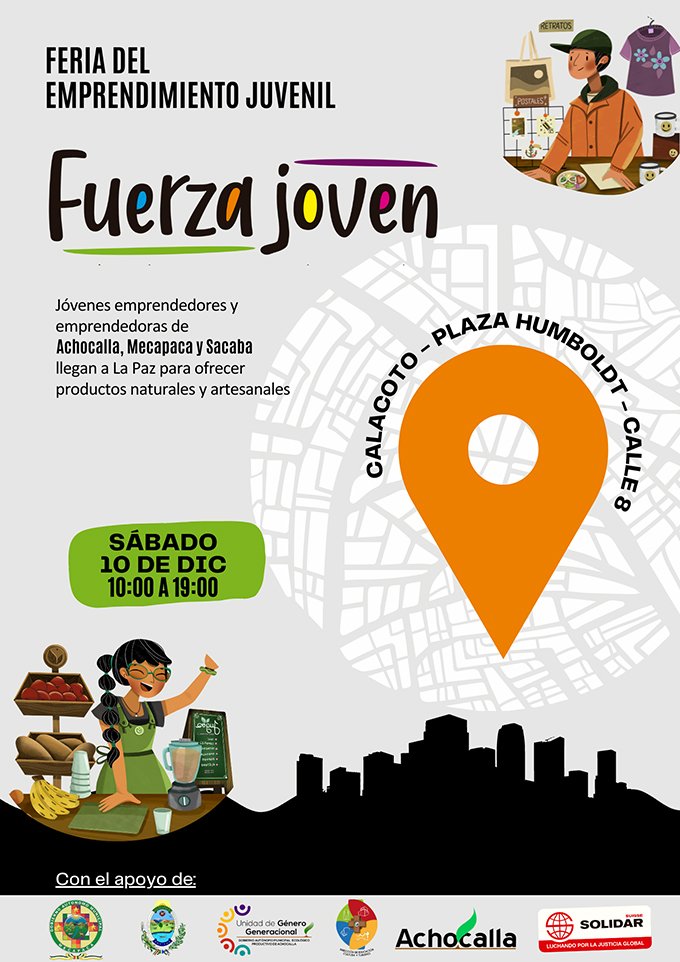 Jóvenes de Achocalla, Mecapaca y Sacaba exponen sus productos y servicios en una gran feria que promueve el empleo digno. Madres jóvenes y adolescentes de los tres municipios participan con emprendimientos colectivos. Jóvenes comunicadores y estudiantes proponen juegos y actividades para toda la familia.