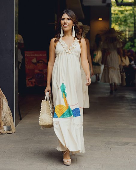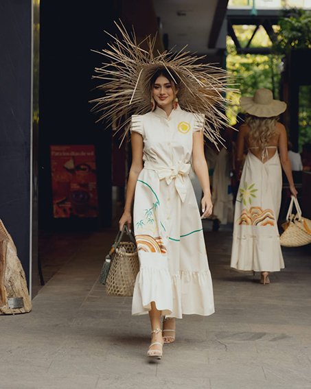 En la pasarela 13 modelos mostraron tres cuadros diferentes como camisolas y camiseros, en la segunda estampas impresas con la palmera de Saó que son vestidos playeros amplios con muchos volados y por último el algodón chiquitano pintado a mano con los típicos camiseros y vestidos de temporada con el tipoy descontraído.