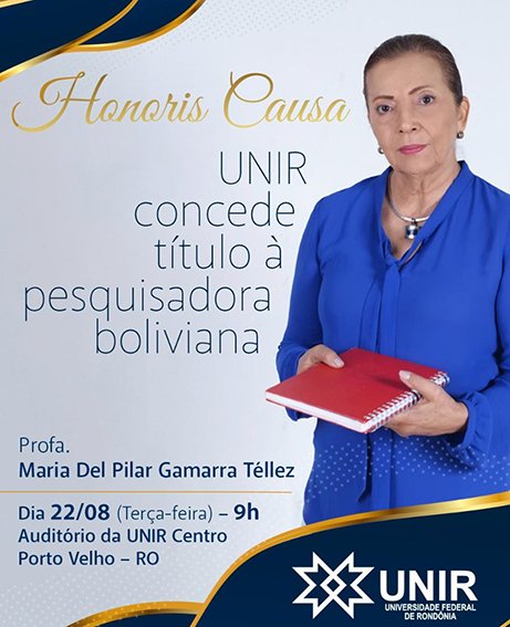 Este martes 22 de agosto, la Universidad Federal de Rondonia (UNIR) otorgará el título de Doctora Honoris Causa a la historiadora boliviana María Del Pilar Gamarra Téllez, en reconocimiento a su amplio y relevante trabajo realizado en el área de Historia de la Amazonia Boliviana, evento que se llevará a cabo en Porto Velho, en el estado de Rondonia, Brasil.