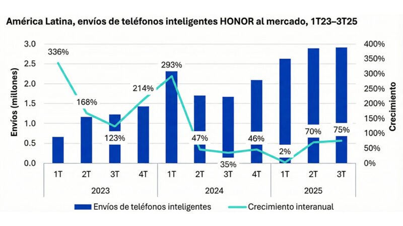 HONOR se posicionó como el fabricante de smartphones con mayor crecimiento global en 2025, registrando una expansión del 55% en envíos internacionales, de acuerdo con el más reciente informe de la firma internacional Omdia. El reporte revela un dato clave para la región: Latinoamérica se consolida como el principal mercado estratégico de HONOR a nivel global, con crecimientos de hasta 478% en países como Brasil, Perú, Ecuador, México y países de Centroamérica.