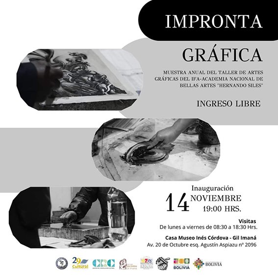 12 de noviembre del 2024. El Centro de la Revolución Cultural (CRC) y la Casa Museo Inés Córdova-Gil Imaná, dependientes de la Fundación Cultural del Banco Central de Bolivia, junto al Instituto de Formación Artística Academia Nacional de Bellas Artes Hernando Siles, inauguran la exposición temporal Impronta gráfica, muestra anual del Taller de Artes Gráficas de esta prestigiosa casa de estudios.