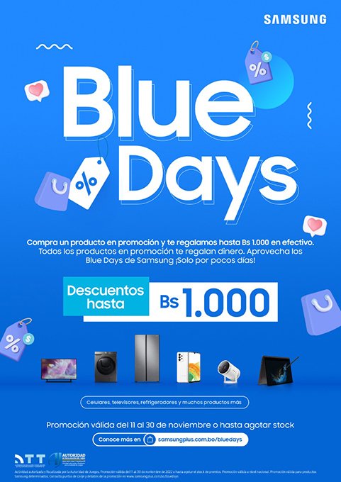 Noviembre de 2022. Samsung inicia los “Blue Days”, días de descuento con premios inmediatos para todos en productos Samsung en promoción. Desde el 11 hasta el 30 de noviembre, los usuarios recibirán una bonificación económica por la compra de un celular, laptop, televisor, refrigerador, lavadora, microonda, cocina, horno o monitor.