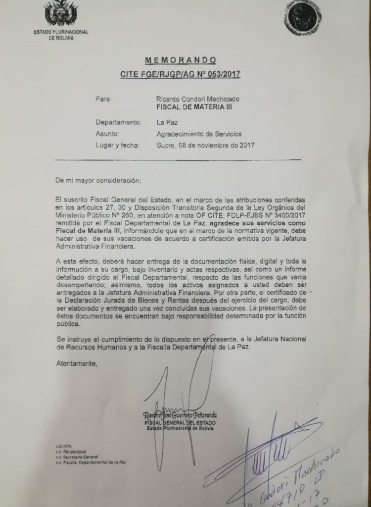 Entre tanto, el fiscal general del Estado, Ramiro Guerrero, emitió el memorando de destitución en el que le agradecen a Condori los servicios prestados como Fiscal de Materia III. «A primera hora firmé su destitución y se la mandó vía fax (a La Paz)”, declaró Guerrero. Añadió que tras conocer que la autoridad jurisdiccional dictó la detención domiciliaria instruyó que «se apele esa decisión”, porque «no se encubrirá” a ningún miembro del Ministerio Público cuya misión es proteger los derechos de la ciudadanía.