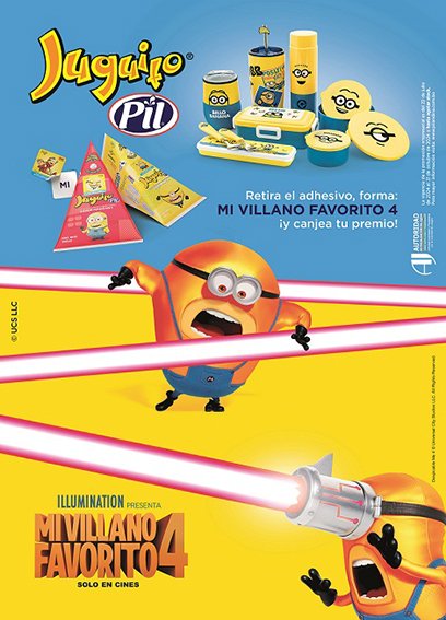 ¿En qué consiste la campaña? Laura Lozano, Gerente de Marketing de PIL Andina, explicó que los empaques de Juguito PIL llevan un adhesivo que contiene, al reverso, una sílaba de la frase “Mi Villano Favorito 4”. La cual una vez se complete, podrá ser canjeada en bodegas Pil (seleccionadas) y PIL Express por diferentes premios: tomatodos, loncheras, cubiertos, vasos térmicos, entre otros.