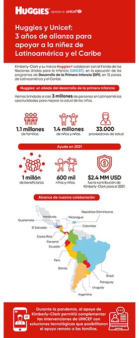 TRES AÑOS DE UNA ALIANZA SÓLIDA. A través del programa de la marca Huggies® “Un Abrazo Para Cada Bebé», Kimberly-Clark contribuye a que cada vez más niños y niñas en la región reciban el cuidado que necesitan desde el primer abrazo. La compañía ha contribuido con US$7.2 millones a los programas regionales de UNICEF dirigidos al desarrollo de los más pequeños y sus familias.