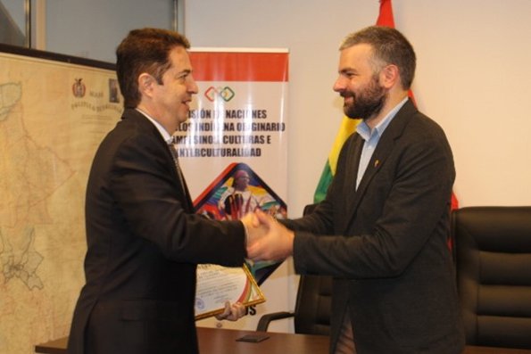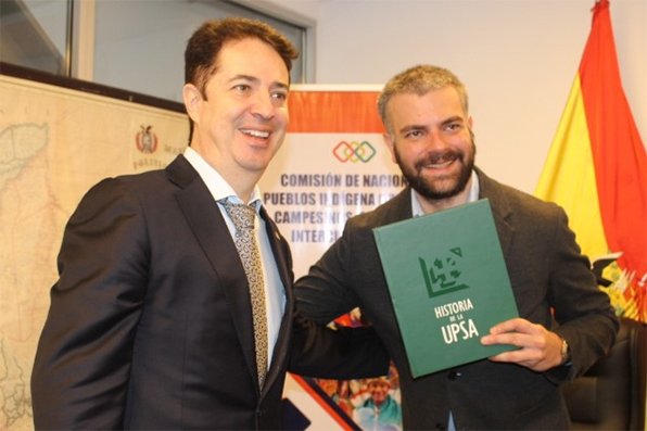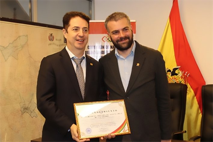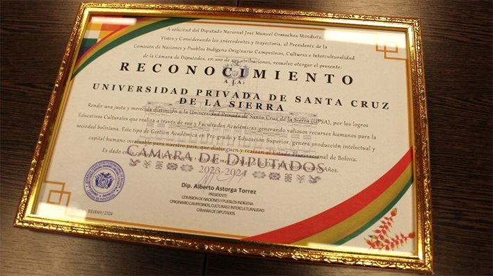 La Paz, Bolivia. La Universidad Privada de Santa Cruz de la Sierra (UPSA) recibió por parte de la Comisión de Naciones y Pueblos Indígena Originario Campesino, Culturas e Interculturalidad de la Cámara de Diputados de Bolivia, el reconocimiento a su trayectoria institucional en el marco de su aniversario 40, entregado por el diputado José Manuel Ormachea Mendieta, a Federico Stelzer Castedo, vicepresidente del Directorio UPSA, y Luis Foianini, director de Vínculo Empresarial de la Universidad.
