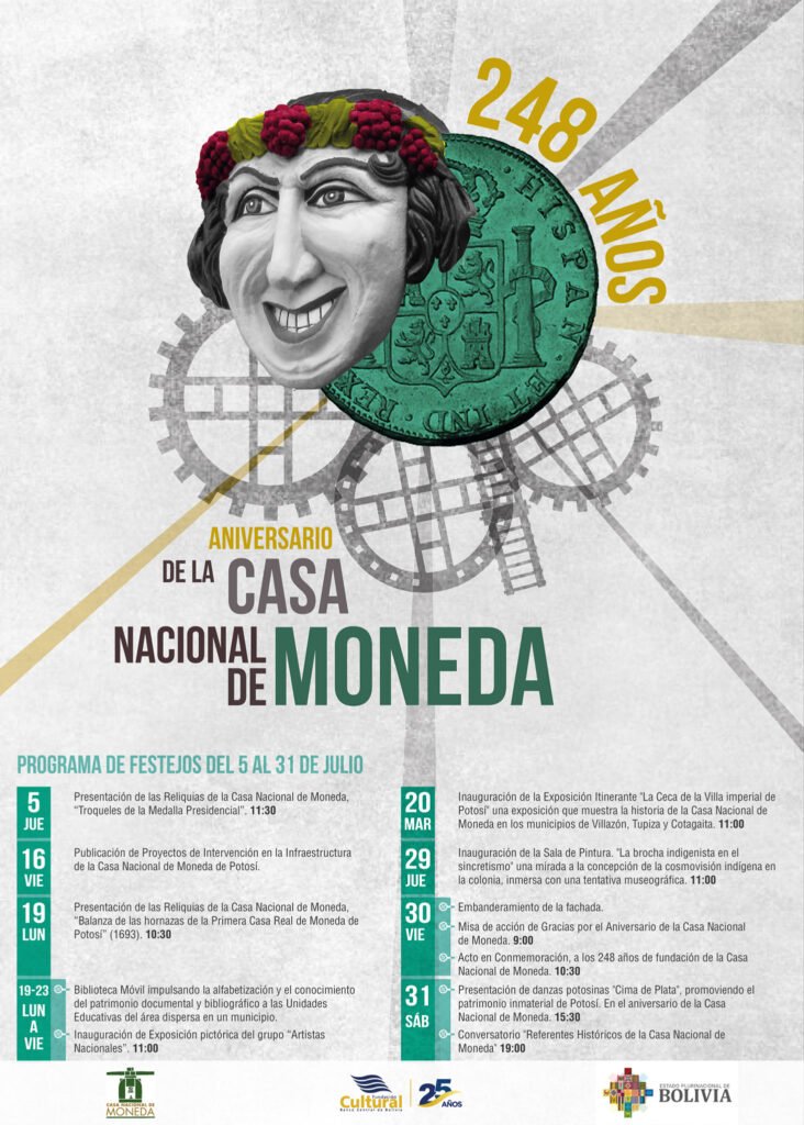 Para cerrar con broche de oro, el sábado 31 de julio a las 10:30, se desarrollará, para toda la población, la presentación de danzas potosinas “Cima de Plata”, que tiene el objetivo de promover el patrimonio inmaterial de esta ciudad. Y a las 19:00, se realizará el Conversatorio internacional “Referentes Históricos de la Casa Nacional de Moneda”.