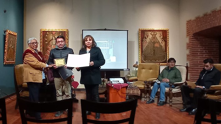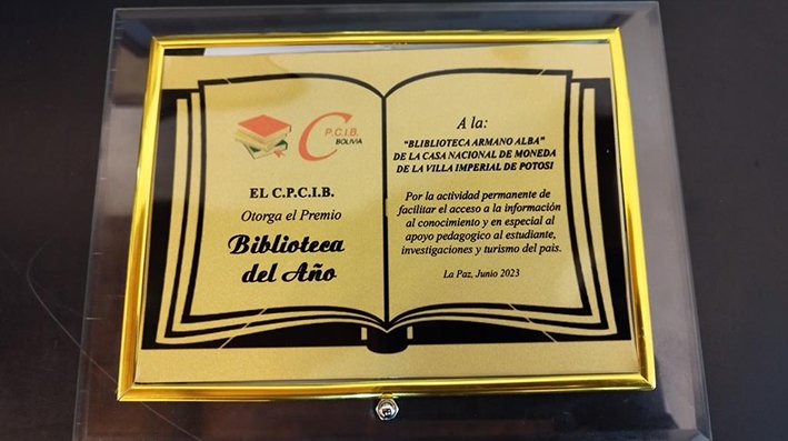 Norah Camberos Bolaños, secretaria general y coordinadora nacional del Colegio de Profesionales en Ciencias de la Información de Bolivia (CPCIB), realizó la entrega del Reconocimiento como “Biblioteca del Año” a la Biblioteca Armando Alba de la Casa Nacional de Moneda, por la actividad permanente de facilitar el acceso a la información, al conocimiento y en especial al apoyo pedagógico, a estudiantes, investigaciones y turismo del país.