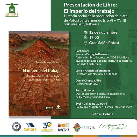 La Casa Nacional de Moneda, dependiente de la Fundación Cultural del Banco Central de Bolivia, realizará el próximo 12 de noviembre, a horas 17:00, en el Gran Salón Potosí, la presentación del libro «El imperio del trabajo. Historia social de la producción de plata de Potosí para el mundo (siglos XVI-XVIII)», de la historiadora Rossana Barragán Romano.