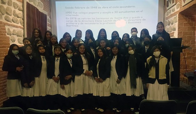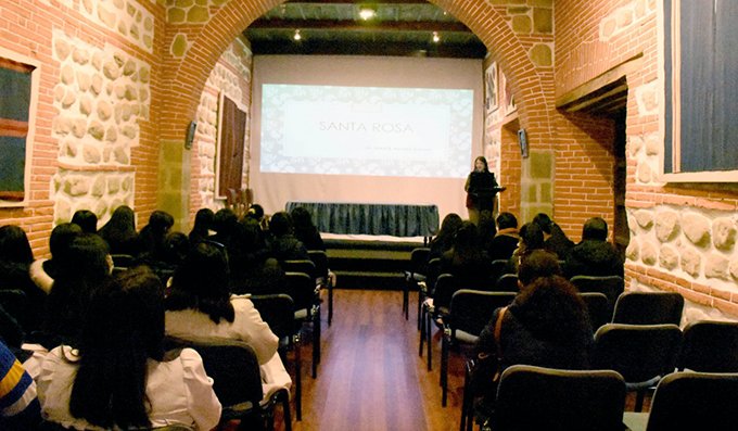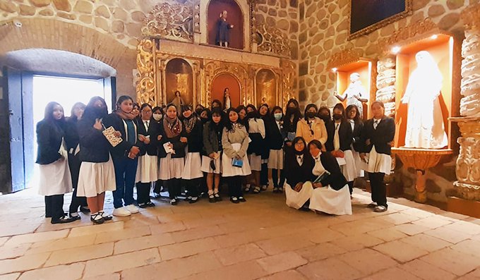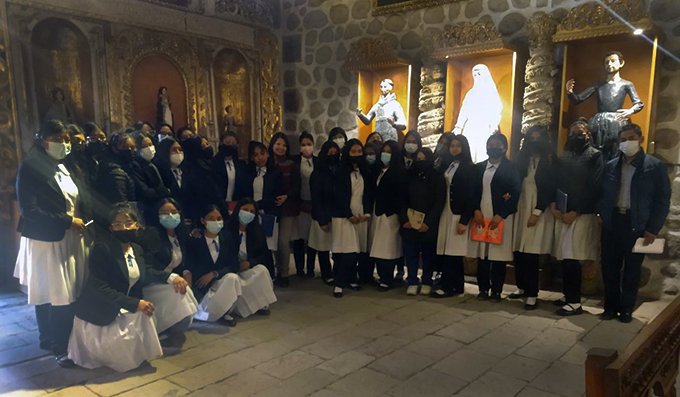 Después de una charla informativa realizada por el personal de museo de la CNM, las jóvenes estudiantes pasaron hacia la sala de retablos, donde se encuentra una parte del retablo principal que habría pertenecido a la iglesia, de la cual no se tiene mucha información y fue transformada en el salón de actos del colegio que lleva el nombre en honor a la Patrona de América y santa nacida en la población potosina de Porco: “Santa Rosa de Lima”. Las estudiantes quedaron muy sorprendidas al conocer que una parte de su colegio, está en la sala de exposición permanente de este museo.