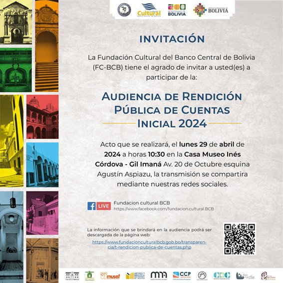 La Fundación Cultural del Banco Central de Bolivia (FC-BCB) realizará su Rendición Pública de Cuentas Inicial 2024 en la Casa Museo Inés Córdova- Gil Imaná este lunes 29 de abril a las 10:30. Con la acción, la entidad reafirma su responsabilidad de informar, a la sociedad civil, sobre el trabajo que desarrolla para recuperar, fortalecer, proteger, custodiar, conservar, registrar, restaurar, promover y poner en valor el patrimonio cultural tangible e intangible del Estado Plurinacional de Bolivia.