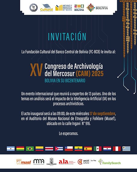 El Archivo y Biblioteca Nacionales de Bolivia, dependiente de la Fundación Cultural del Banco Central de Bolivia, invita al XV Congreso de Archivología del Mercosur (CAM) 2025: Bolivia en su Bicentenario
