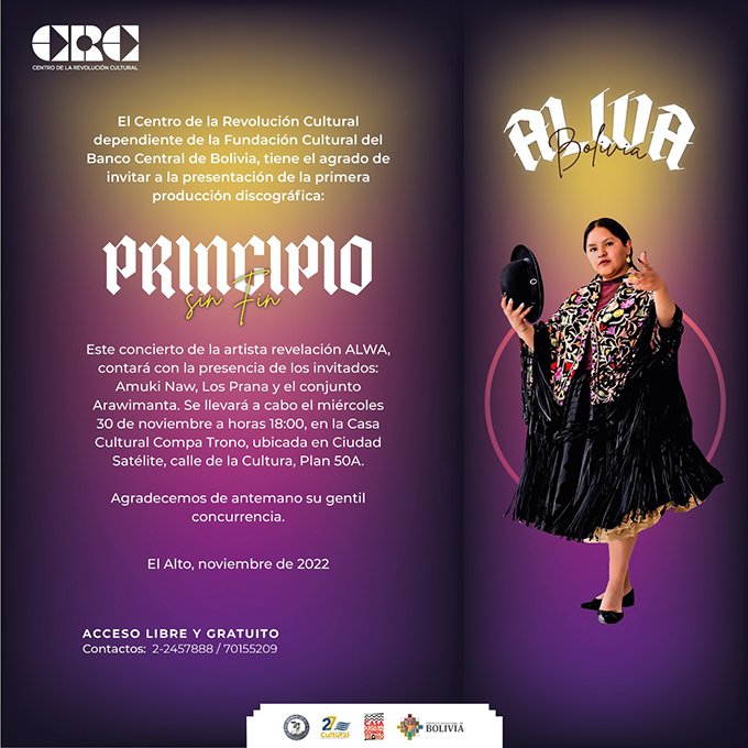 Alwa presentará su primera producción discográfica «Principio Sin Fin» el miércoles 30 de noviembre, a las 18:00, en la Casa Cultural Compa Trono, ubicada en ciudad Satélite, calle de la Cultura (50 A). El concierto contará con la presencia de artistas invitados como Amuki Naw, Los Prana y el Conjunto Arawimanta. El ingreso es gratuito y para toda la población.