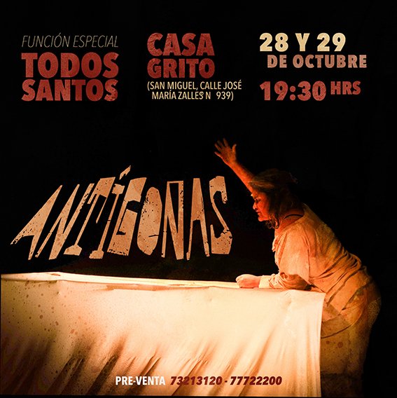 Durante los últimos días del mes de octubre – 28 y 29 de octubre -, Casa Grito (José María Zalles 939. San Miguel) albergara la pieza teatral «Antígonas» un monólogo, interpretado por Samadi Valcárcel, que fue dirigido por cinco directoras: Elena Filomeno, Francia Oblitas, Gladys Cruz, Gabriela Paz y Sasha Salaverry. La dramaturgia fue hecha por Katy Bustillos Vila y Samadi Valcárcel. La composición sonora estuvo a cargo de Nebaí Ríos. La escenografía a cargo de Daniel Bustillos y Antonio Valcarcel. El diseño de iluminación estuvo a cargo de Joe Salinas. Las artes visuales fueron hechas por Israel Alberto.