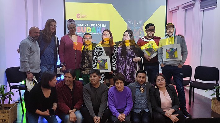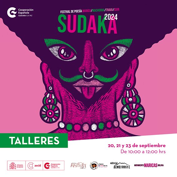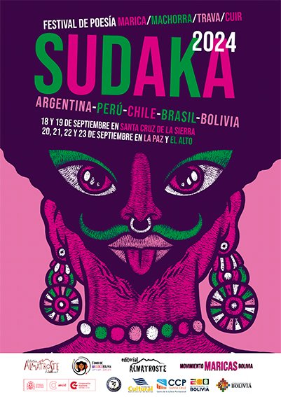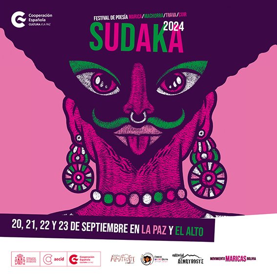 Gracias al trabajo del Movimiento Maricas Bolivia, la Colectiva Transcultural Almatroste y el apoyo del Centro Cultural de España en La Paz (CCELP), el Centro de la Cultura Plurinacional de Santa Cruz (CCP) y el Fondo de Mujeres de Bolivia-Apthapi Jopueti; La Paz, El Alto y Santa Cruz de la Sierra serán el lugar de encuentro del Festival de poesía Sudaka Marica-Machorra-Trava-Cuir 2024, un evento dedicado al arte, literatura, acción callejera y reflexión pública para poner en perspectiva la representación de diversas disidencias sexuales y de género en nuestra región y así, lograr un espacio en contra de los prejuicios, la explotación económica y el racismo.