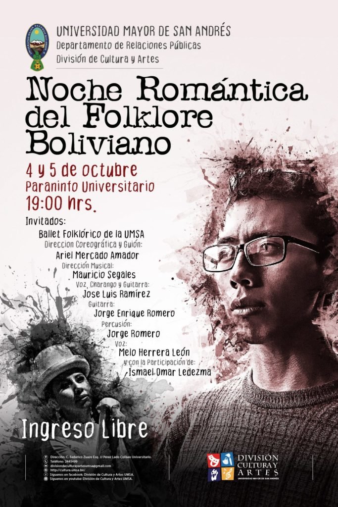 El jueves 4 y viernes 5 de octubre, la Universidad Mayor de San Andrés (UMSA) presentará el espectáculo denominado «Noche Romántica del Folklore Boliviano» que rescata canciones del acervo nacional, las cuales se plasmarán en la danza y de la música.