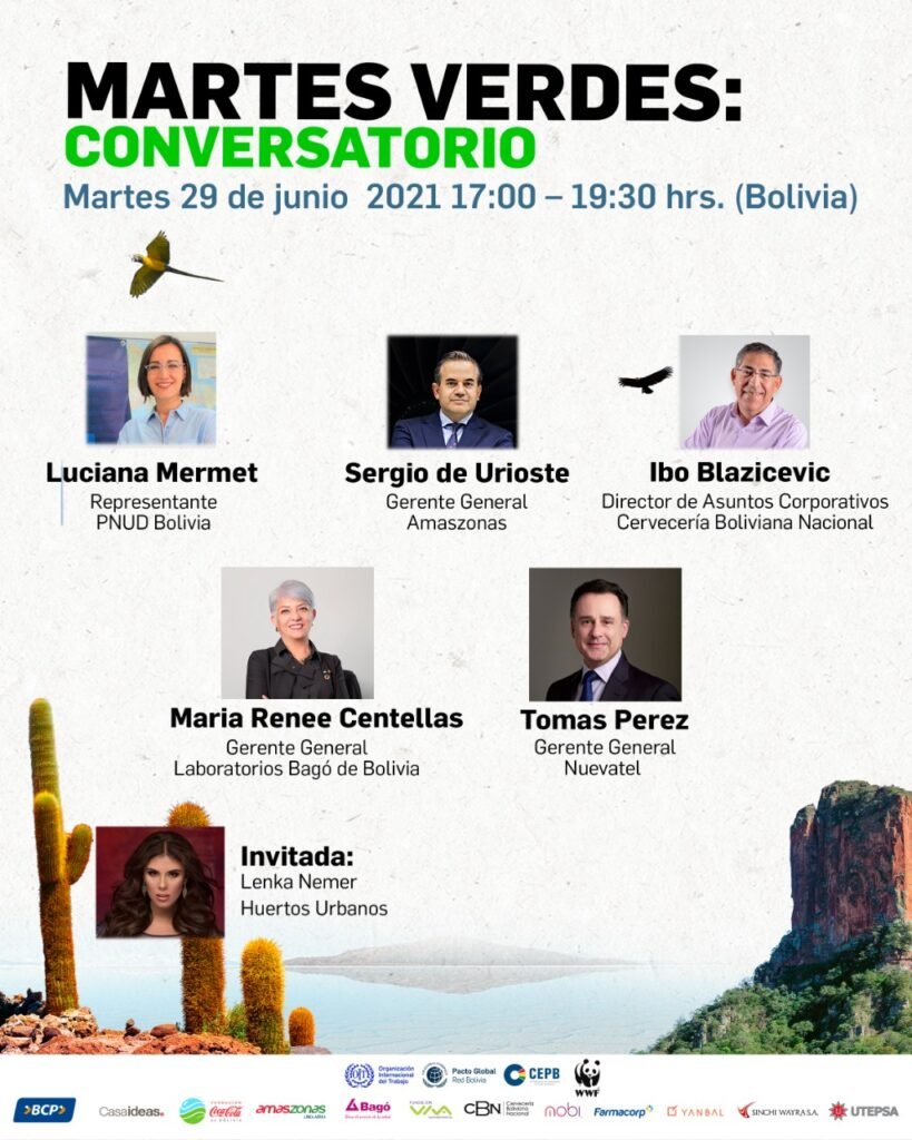 El ciclo de Martes Verdes es organizado por la Confederación de Empresarios Privados de Bolivia (CEPB), como representante del United Nations Global junto con la Organización Internacional del Trabajo – OIT y el Fondo Mundial para la Naturaleza – WWF Bolivia, en el marco de la Presentación Oficial de la Mesa de Medio Ambiente en la cual Laboratorios Bagó de Bolivia S.A. es líder y participa junto a importantes empresas como Amaszonas, Banco de Crédito BCP, Cervecería Boliviana Nacional, Fundación Coca-Cola Bolivia, Farmacorp, VIVA, Casaideas, Mobi, Sinchi Wayra, UTEPSA y Yanbal Bolivia. Este ciclo inició de manera virtual el martes 29 de junio y finalizará el martes 13 de julio sensibilizando con un mensaje de llamado a la acción empresarial por la protección de nuestro planeta.