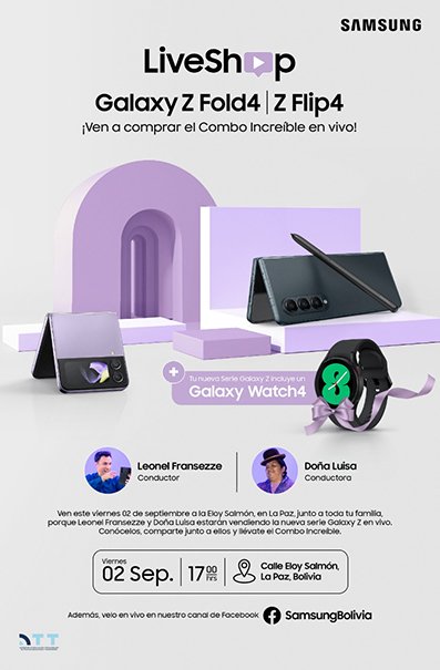 Bolivia, septiembre de 2022. Con la finalidad de acercar sus productos a las paceñas y los paceños, Samsung anuncia su próximo LiveShop (venta en vivo) para el viernes 2 de septiembre, en La Paz. En esta ocasión, la gente podrá comprar el Combo Increíble, que es un Galaxy Z Flip4 o Z Fold4 que incluye un Galaxy Watch4, de la mano de sus influencers favoritos.