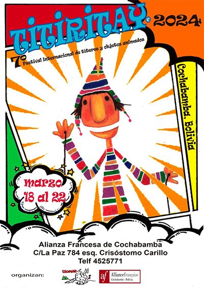 El Festival Internacional Titiritay, en su séptima versión, se realizará del lunes 18 al viernes 22 de marzo de 2024 en la Alianza Francesa de Cochabamba, coorganizado con Leomar Títeres (Argentina).