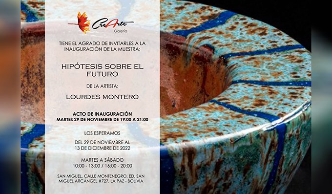 «Hipótesis sobre el futuro» es el título de la exposición de cerámica contemporánea que presentará Lourdes Montero. Se desarrollará del 29 de noviembre al 13 de diciembre de 2022, en la Galería Crearte (San Miguel, calle Montenegro Edf. San Miguel Arcángel #727), de la ciudad de La Paz.