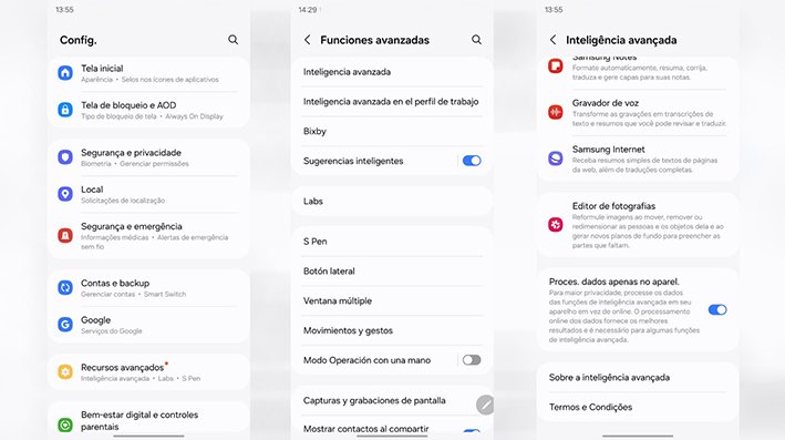 Para acceder a la configuración de AI, los usuarios deben abrir Configuración, seleccionar Funciones avanzadas y, a continuación, Inteligencia avanzada. Aquí se encuentra la opción «Procesar datos solo en el dispositivo».