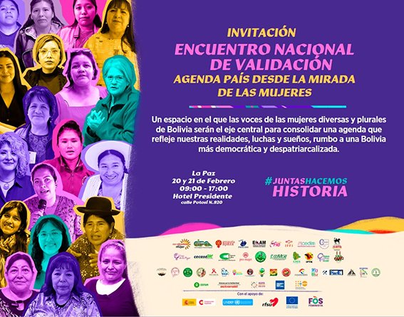 La Agenda país desde la mirada de las mujeres es el resultado de un intenso trabajo que se desarrolló en los nueve departamentos de Bolivia, desde el año pasado, a través de un proceso altamente participativo de diálogo y reflexión, que movilizó a 678 lideresas de 250 organizaciones del área urbana y rural del país. En este encuentro nacional se validará dicha Agenda.