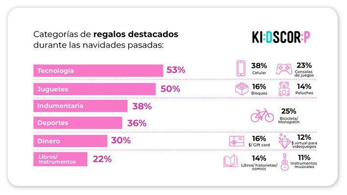 Kids (6-12 años): Juguetes tecnológicos, como consolas y drones (48%), juguetes al aire libre, como bicicletas y patines (32%), y sets de construcción y creatividad (25%).