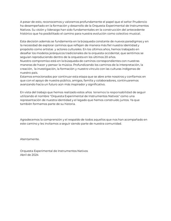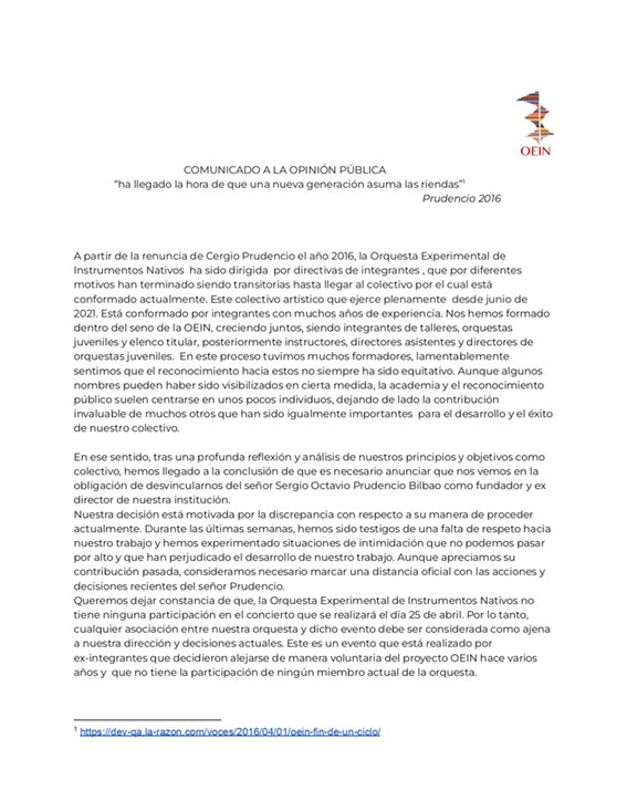 A través de un comunicado la opinión pública, la Orquesta Experimental de Instrumentos Nativos (OEIN) anunció su desvinculación de Cergio Octavio Prudencio Bilbao, fundador y exdirector del proyecto.