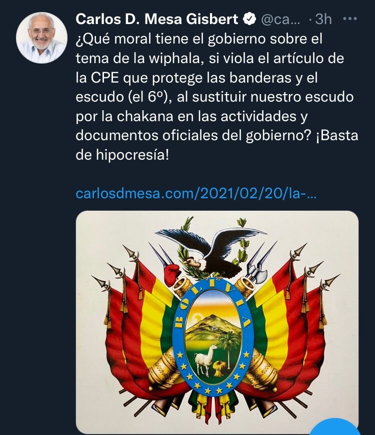 Mediante Twitter, el líder de Comunidad Ciudadana (CC) y expresidente, Carlos Mesa, le dijo al gobierno central que no tenía moral sobre el tema de la whipala “si viola el artículo de la CPE que protege banderas y el escudo (el 6°), al sustituir nuestro escudo por la chakana”. Paralelamente, en videos difundidos en redes sociales, se observa a diputados de CC, que, durante una alocución en Plaza Murillo, fueron increpados por referirse a este tema. (Mira el video aquí).