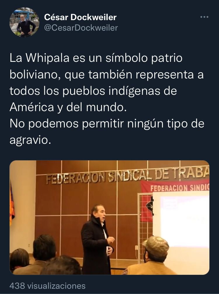 César Dockweiler, en su cuenta de Twitter, expresó: “La Whipala es un símbolo patrio boliviano, que también representa a todos los pueblos indígenas de América y del mundo. No podemos permitir ningún tipo de agravio”.