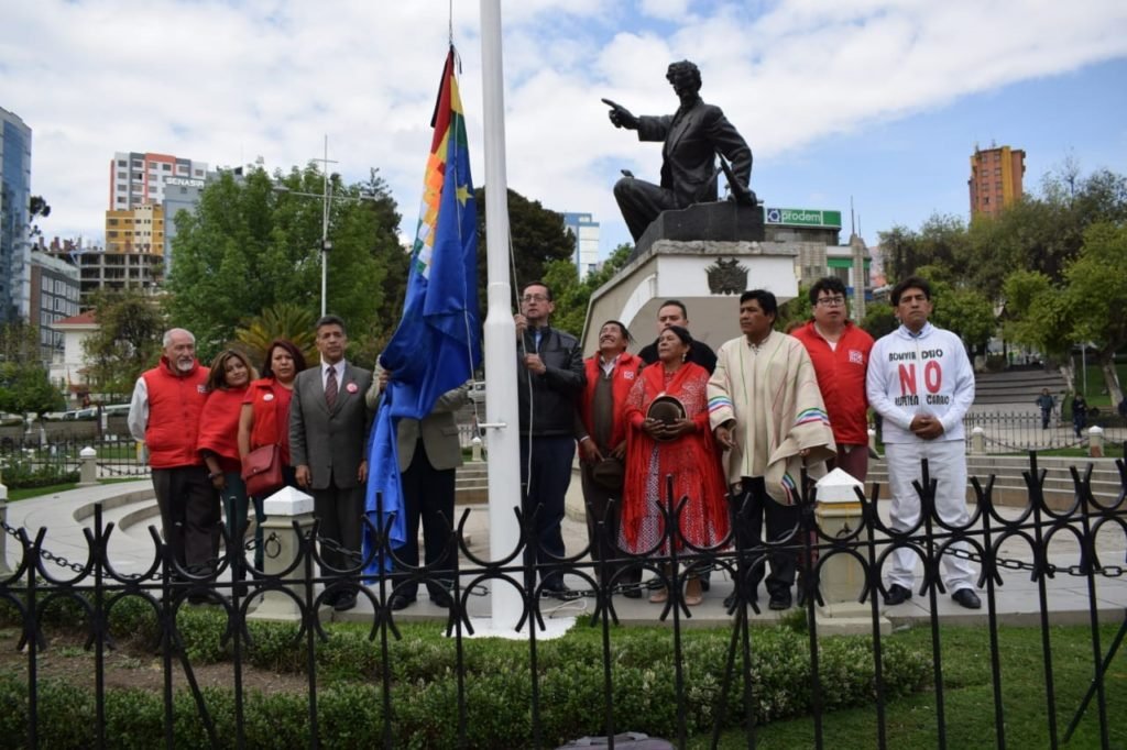 El candidato recordó la fecha con la iza de la bandera de la causa marítima, en una acción de desagravio por el fallo adverso para Bolivia.