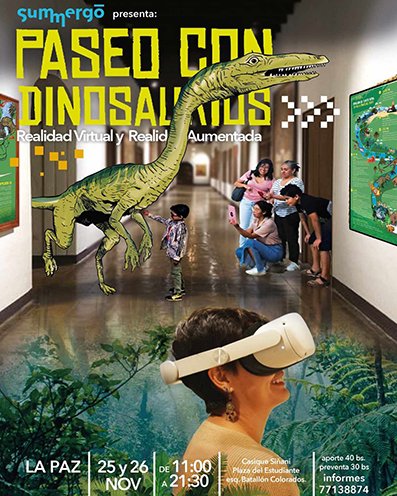 Volver a la prehistoria boliviana, encontrar los gigantes del pasado en un viaje virtual e interactuar con ellos: es la propuesta de “Paseo con dinosaurios”, que se llevará a cabo en La Paz y que, gracias a la realidad virtual y la realidad aumentada, permitirá a los asistentes de viajar en el tiempo, más de 60 millones de años atrás. Un proyecto realizado por Summergō Lab para la educación tecnológica y la divulgación científica, a través de reconstrucciones y animaciones 3D del patrimonio paleontológico nacional. Esta exhibición tecnológica permitirá a los visitantes descubrir paisajes y criaturas del pasado del Planeta Tierra a través de las experiencias inmersivas.