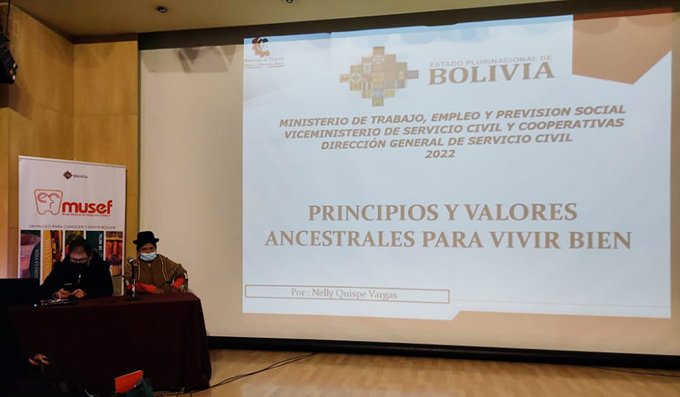 Este evento, cuenta también con la participación de Nelly Quispe, profesional de Ética, quién es la encargada del tema principios y valores ancestrales para vivir bien, temática a desarrollarse en este taller el resto de jornada.