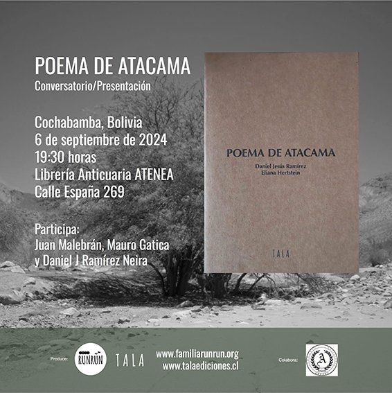 Este viernes 6 de septiembre, a las 19:30, en la librería y anticuaria Atenea, ubicada en calle España 222, entre Colombia y Ecuador, se presenta Poema de Atacama, libro de los autores chilenos Daniel Ramírez Neira y Eliana Hertstein, ambos del colectivo poético y sonoro Familia Runrún, quienes el 2022 presentaron la obra escénica y musical “La extranjera” en el mARTadero de Cochabamba.