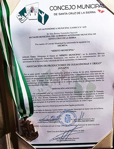 Santa Cruz, septiembre 24 de 2023. “Por su gran aporte como institución gremial a través de los años, representando y defendiendo los derechos y los intereses de los productores (…) convirtiéndose en un eslabón fundamental en la cadena productiva de oleaginosas dentro de nuestro municipio y del país”, cita la ley autonómica municipal 1633 que otorga la Medalla al Mérito Municipal a la Asociación de Productores de Oleaginosas y Trigo (Anapo).