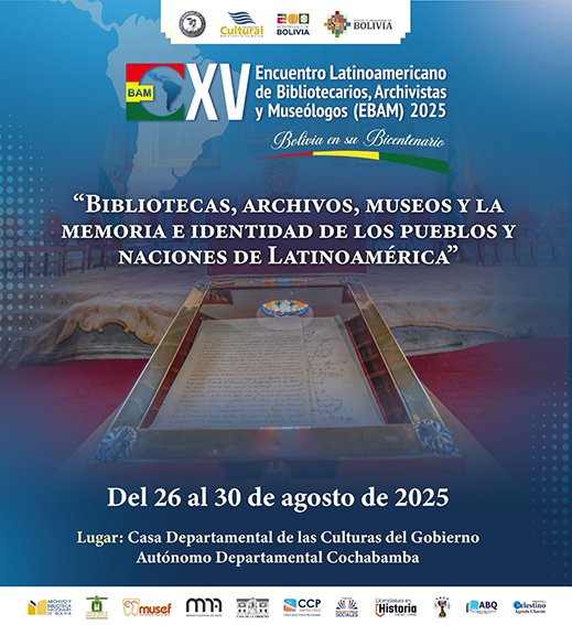 En el marco de los festejos del Bicentenario, Bolivia es sede del XV Encuentro Latinoamericano de Bibliotecarios, Archivistas y Museólogos (EBAM), que se desarrollará del 26 al 30 de agosto de 2025 en la ciudad de Cochabamba. El plazo para presentar ponencias, informes de trabajo, carteles o afiches vence el 7 de julio.