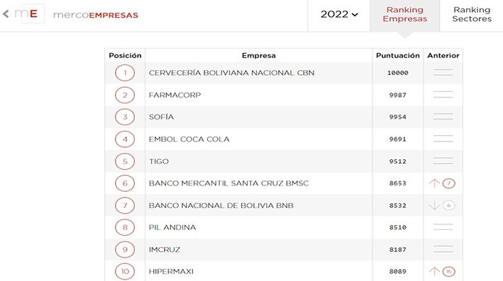 Merco (Monitor Empresarial de Reputación Corporativa) es el monitor corporativo de referencia en Iberoamérica que viene evaluando la reputación de las empresas desde el año 2000 y en Bolivia desde 2013. Es un instrumento de evaluación reputacional basado en una metodología multistakeholder compuesta por seis evaluaciones de múltiples fuentes de información entre ellas, por ejemplo, directivos de empresas en Bolivia que facturan más de 15 millones de dólares, analistas financieros, representantes de ONG, periodistas del área económica, catedráticos empresariales, Dircom, expertos en RSC, miembros de sindicatos y social media manager.