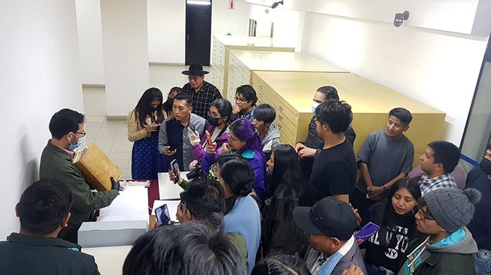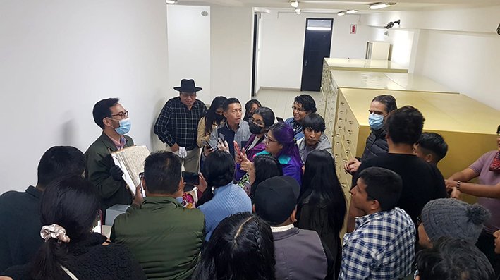 Posteriormente, docente y estudiantes realizaron una visita guiada por los espacios del ABNB que comenzó en la sala que lleva el nombre del gran investigador, archivista y bibliógrafo Gabriel René Moreno, con su impresionante Biblioteca que sobrevivió a tres incendios, donde pudieron apreciar el fondo de libros antiguos, admirando los ejemplares de la tercera parte de la Suma Teológica de Santo Tomás de Aquino, publicada el año 1493; la primera edición del Vocabulario de la lengua aymara de Ludovico Bertonio y otras joyas bibliográficas, además de observar también los ejemplares originales del periódico El Cóndor de Bolivia, de la colección Moreno y la obra Viaje a la América meridional de d’Orbigny.