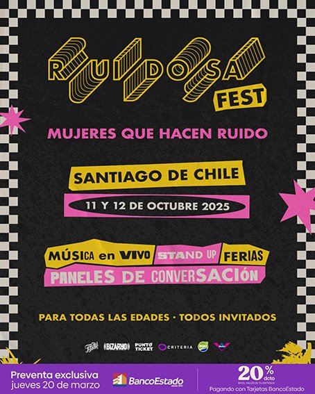Ruidosa Fest Santiago 2025 contará con dos días de celebración de la fuerza femenina con conciertos de artistas chilenas e internacionales, stand up comedy, inspiradores paneles de conversación, exhibiciones y una vibrante feria de organizaciones y emprendedoras, esta vez de la mano de la productora Bizarro. Es un evento para todas las edades, donde todos están invitados.