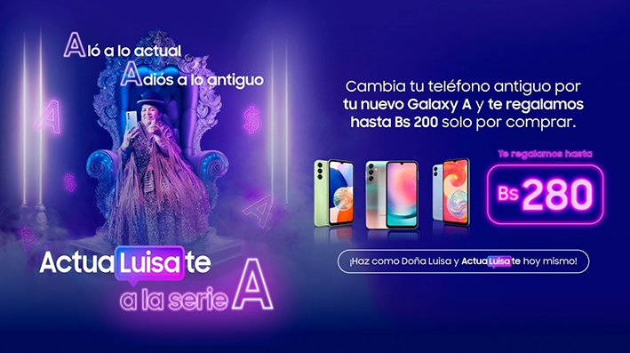 Septiembre 2023. Renovar un smartphone es una decisión importante y muchas veces necesaria, ya que la decisión de compra está en el diseño, la funcionalidad y la inversión. Por esa razón. Samsung da continuidad a la campaña ¡ActuaLUISAte a la serie A! donde los bolivianos pueden actualizar su equipo, registrando su dispositivo anterior, por un Galaxy A04e, A14 o A24 y recibir un premio económico.