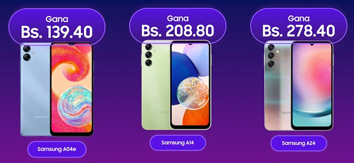 Los participantes que compren un Samsung Galaxy A04e, obtendrán como premio 139.40 bolivianos; por un Samsung Galaxy A14, recibirán Bs 208.80; y por un Samsung Galaxy A24, Bs 278.40. La promoción es válida hasta el 3 de octubre de 2023 o hasta agotar stock. La actividad es regulada y fiscalizada por la Autoridad de Juegos AJ. Para más información, el interesado debe ingresar a samsung.com.bo/actualuisate.