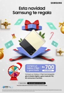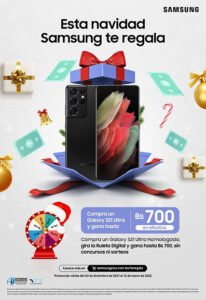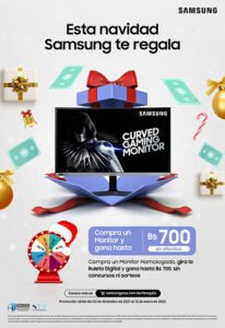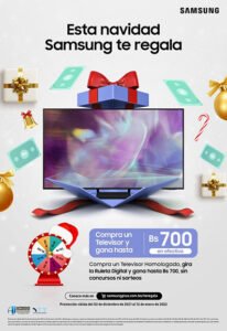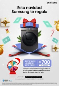 Samsung festeja el mes navideño con premios en efectivo por la compra de productos seleccionados de su ecosistema tecnológico. Los clientes podrán adquirir entre más de 90 equipos como celulares, audífonos inalámbricos, tablets, smartwatch, monitores, lavadoras, refrigeradores y televisores, y participar de la ruleta digital para ganar hasta 700 Bs. por cada compra.