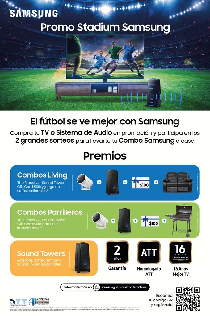 Noviembre, 2022. Este viernes 11 de noviembre, a las 10:00 am, la empresa realizará el primer sorteo de la Promo Stadium Samsung, que se transmitirá a través de su cuenta en Facebook: SamsungBolivia. En el evento, la compañía de tecnología buscará a los primeros ganadores de los Combos Living, Combos Parrilleros y Sound Towers (torres de sonido).