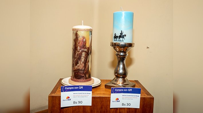 También se exponen las creaciones en velas artesanales decorativas de Marina Lizzeth Garrón Monje, una empresaria de la microempresa que ha logrado especializarse en más de 10 técnicas de producción y aplicaciones artísticas. Los trabajos de esta talentosa emprendedora nacida en la ciudad de Trinidad, Beni se han expuesto en diferentes ferias a nivel nacional.