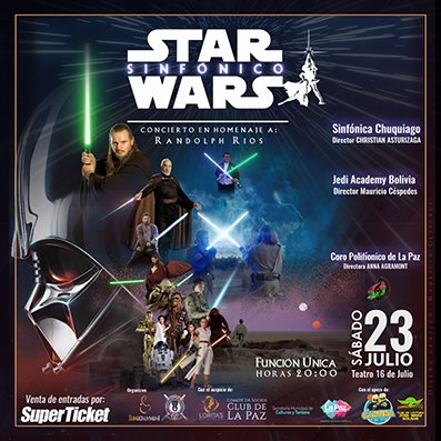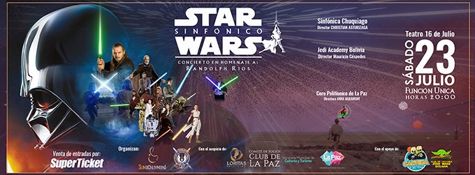 La Orquesta Sinfónica Chuquiago Marka, dirigida por Christian Asturizaga, interpretará composiciones de la mítica saga en homenaje al músico y director Randolph Ríos donde participará también el Coro Polifónico de La Paz a cargo de Anna Agramont. Además, la puesta en escena contará con performance y demostraciones de combate de sables de luz a cargo de la Jedi Academy Bolivia, dirigida por Mauricio Céspedes.