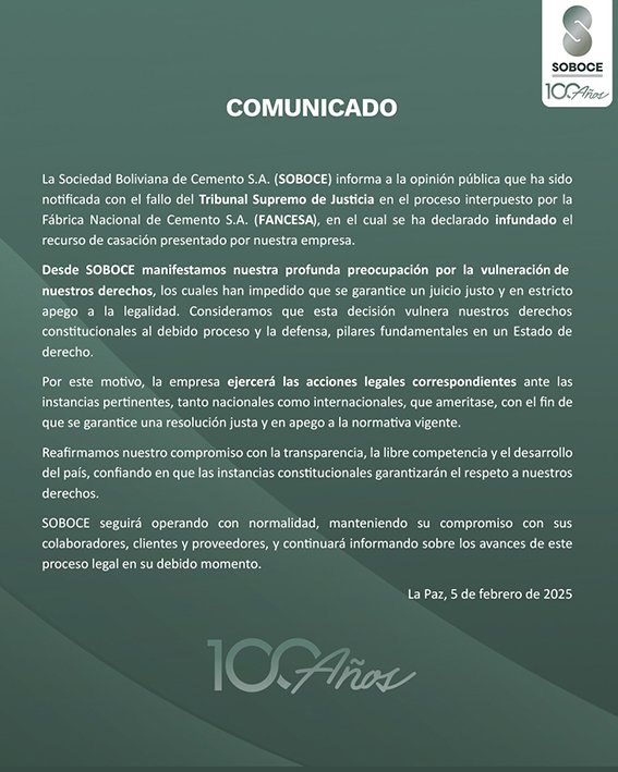 La Paz, 5 de febrero de 2025. La Sociedad Boliviana de Cemento S.A. (Soboce) ha expresado su profunda preocupación por la reciente decisión del Tribunal Supremo de Justicia, que ha declarado infundado el recurso de casación interpuesto por la empresa en el proceso legal con la Fábrica Nacional de Cemento S.A. (Fancesa).