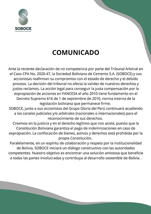 Ante la reciente declaración de no competencia por parte del Tribunal Arbitral en el Caso CPA No. 2020-47, la Sociedad Boliviana de Cemento S.A. (SOBOCE) y sus accionistas reafirman su compromiso con el estado de derecho y el debido proceso. La decisión del tribunal no afecta la validez de nuestros derechos y justos reclamos. La acción legal para conseguir la justa compensación por la expropiación de acciones en FANCESA el año 2010 tiene fundamento en el Decreto Supremo 616 de 1 de septiembre de 2010, norma interna de la legislación boliviana que permanece firme.