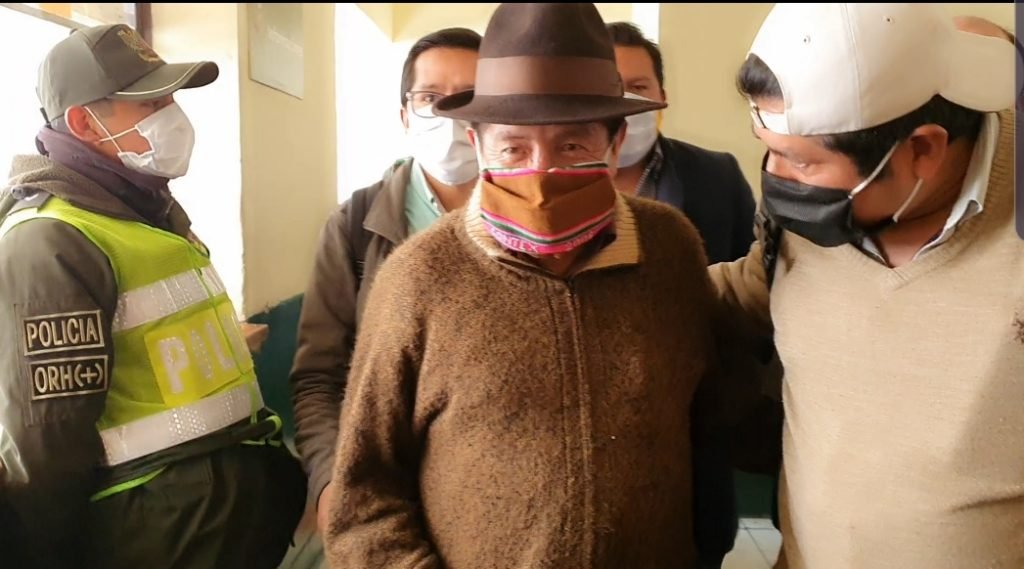 Quispe acudió a esa instancia con un barbijo de aguayo, reiterando que no incumplió la norma que instruye el aislamiento total en el país por la crisis del Covid-19, pese a que un video lo muestra participando de una reunión con campesinos en La Paz.